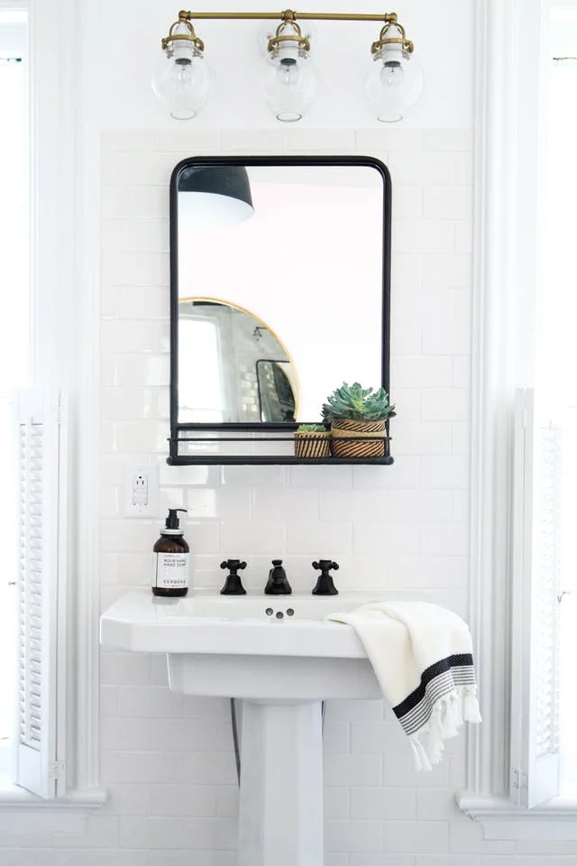 Hello guys! Gosh, it feels good to be back in the designing mindset! Something about gathering pretty inspiration really helps motivate me to get things going! So today, I'm sharing the second design style we're currently inspired by for our bathroom overhaul (you can see our first design style here!) Today's style, Industrial, and more specifically for these bathrooms, black and white! There's something classic about the simple contrast of these two tones and when put in home decor, adds an instant sharpness and class to a space. For Brian and I, we've always been drawn to this style. I love it for it's antique nods, and Brian loves it for its craftsmanship. In our last house, I felt we found the perfect balance of this style for both of us! So, in looking for current inspiration, we were instantly drawn to these spaces below.