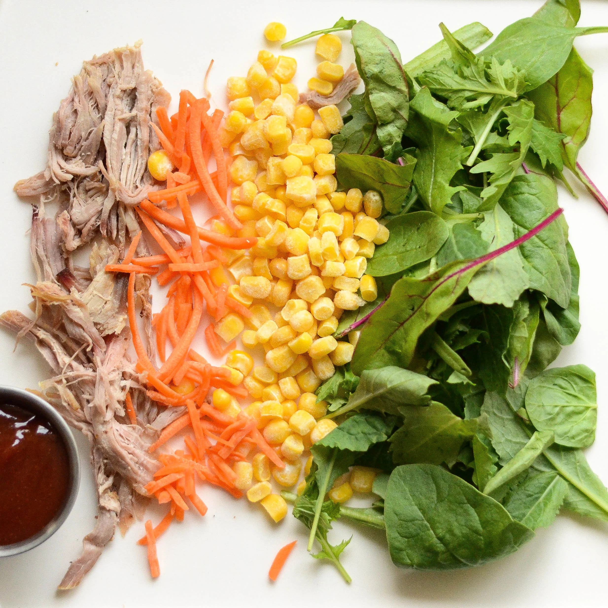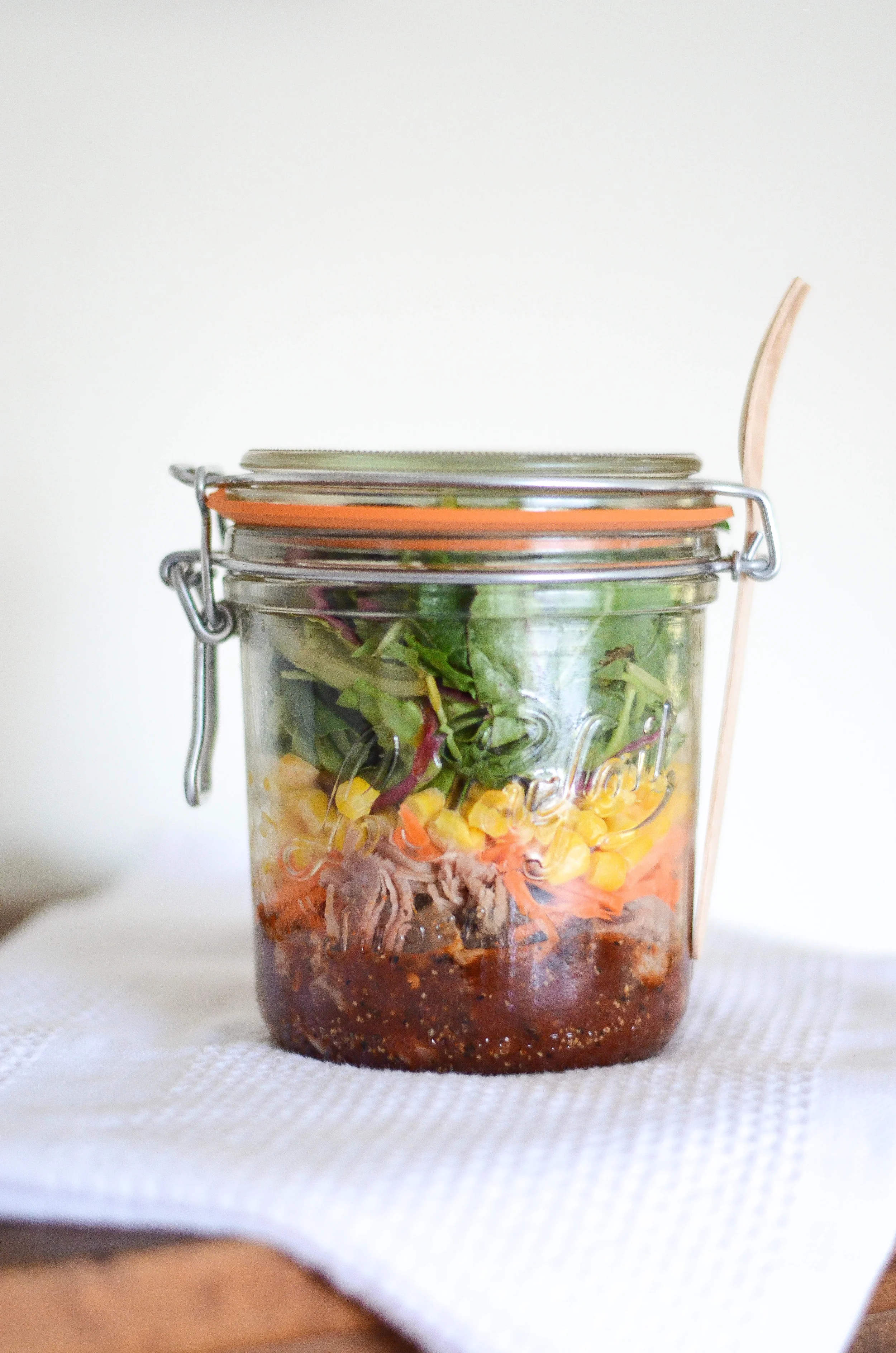So, for today's CAN-do lunch, left-over BBQ pulled pork is made into a canning jar salad to-go (I'm sure you've seen these all over the Pinterest universe). The great part about this layered salad is you layer it upside down, with dressing first. This prevents your salad from getting soggy and when you go to pour it out your salad comes out perfect on a plate ~ genius I tell you. I get lunch...Brian gets lunch...we save some dough...and we use up those leftovers. Win..win...win. The awesome thing, is if I can get myself super organized I could make a stash of canning jar lunches, store them in the fridge and then they're ready to go. No more excuses for not eating lunch!
