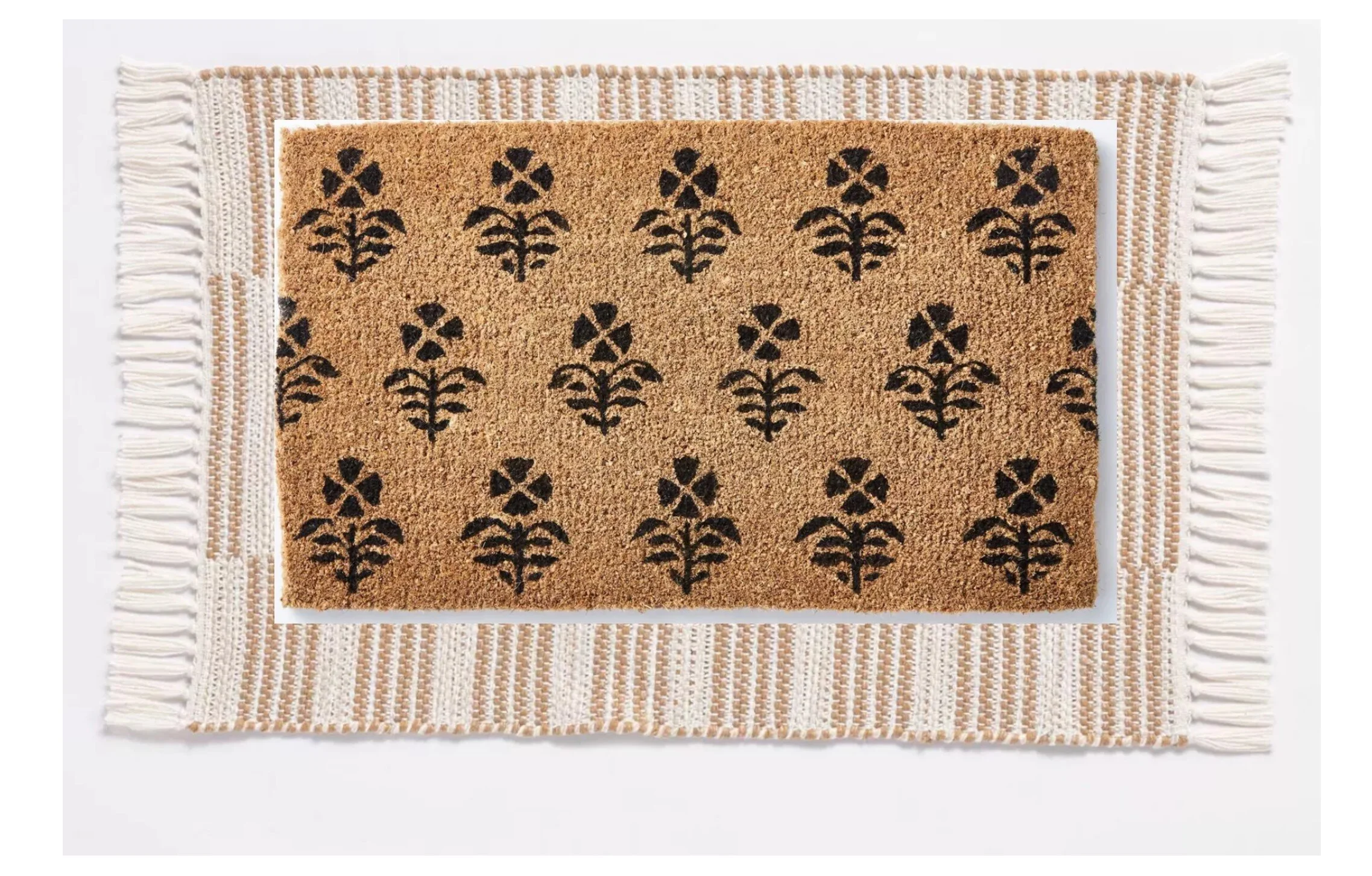 Last week I shared our front porch refresh and look what arrived over the weekend! And I have to say, after going for the layered doormat look I’m obsessed with the amount of subtle texture and warmth it brings to our small concrete front steps! I absolutely love this stripe indoor/outdoor rug for it’s softness and neutral color! Truth be told it looks and feels way more expensive than it was! And for a doormat I went with this block print floral.