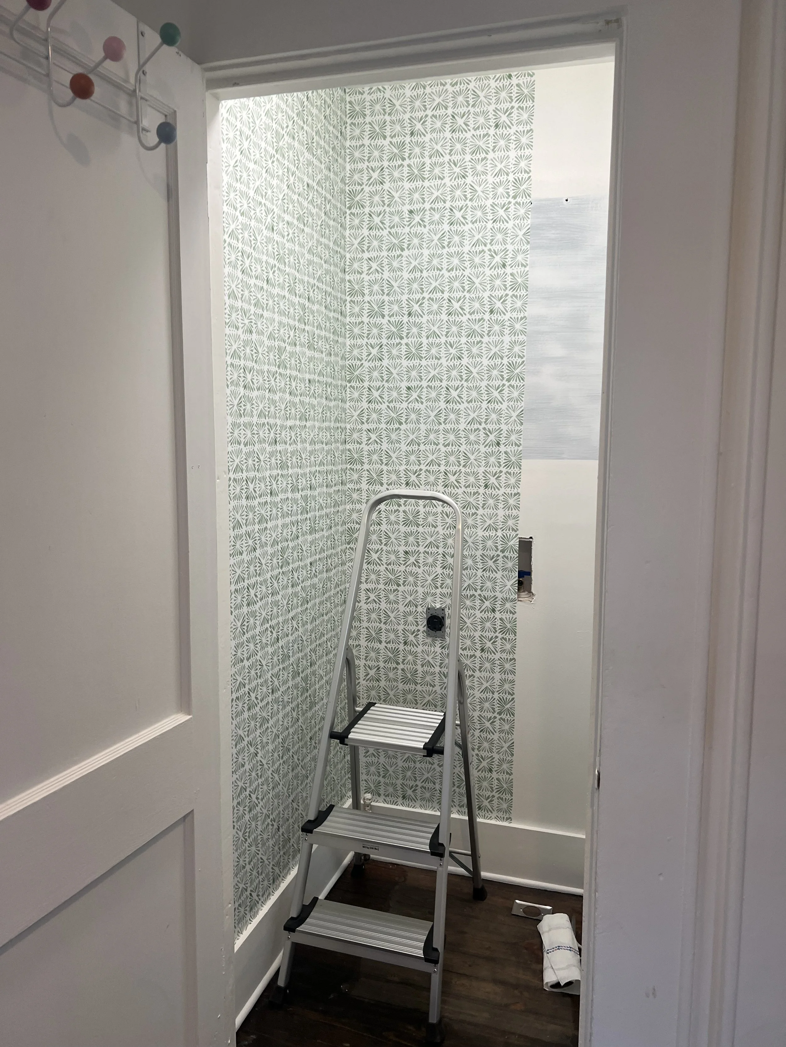 As we’re still figuring out how best to use the space in this new house, I didn’t want to permamenantly remove the washer/dryer hookups. Nor did I want to invest in permanet shelving nor spend a lot of money. So, we opted to use a lot of items we already owned and one of the few things I ended up purchasing was this peel & stick wallpaper.