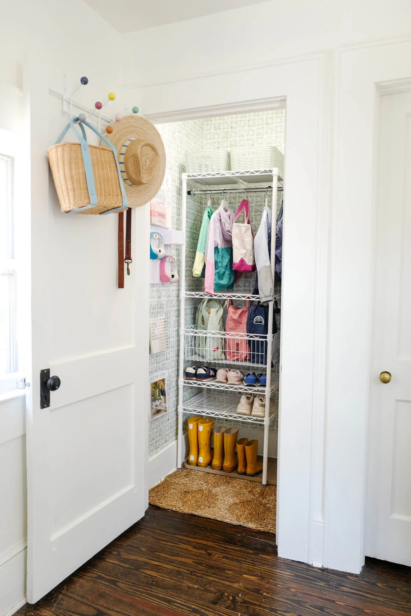 It only took three rolls to cover the closet, and for around $100 it really brightened and cheered up the space. To protect the floors we used remenants of our living room rug (looooooove that these individual squares are so versatile). We used this white shelving unit and added this basket to hold bookbags and this rod to allow a a space to hang coats.