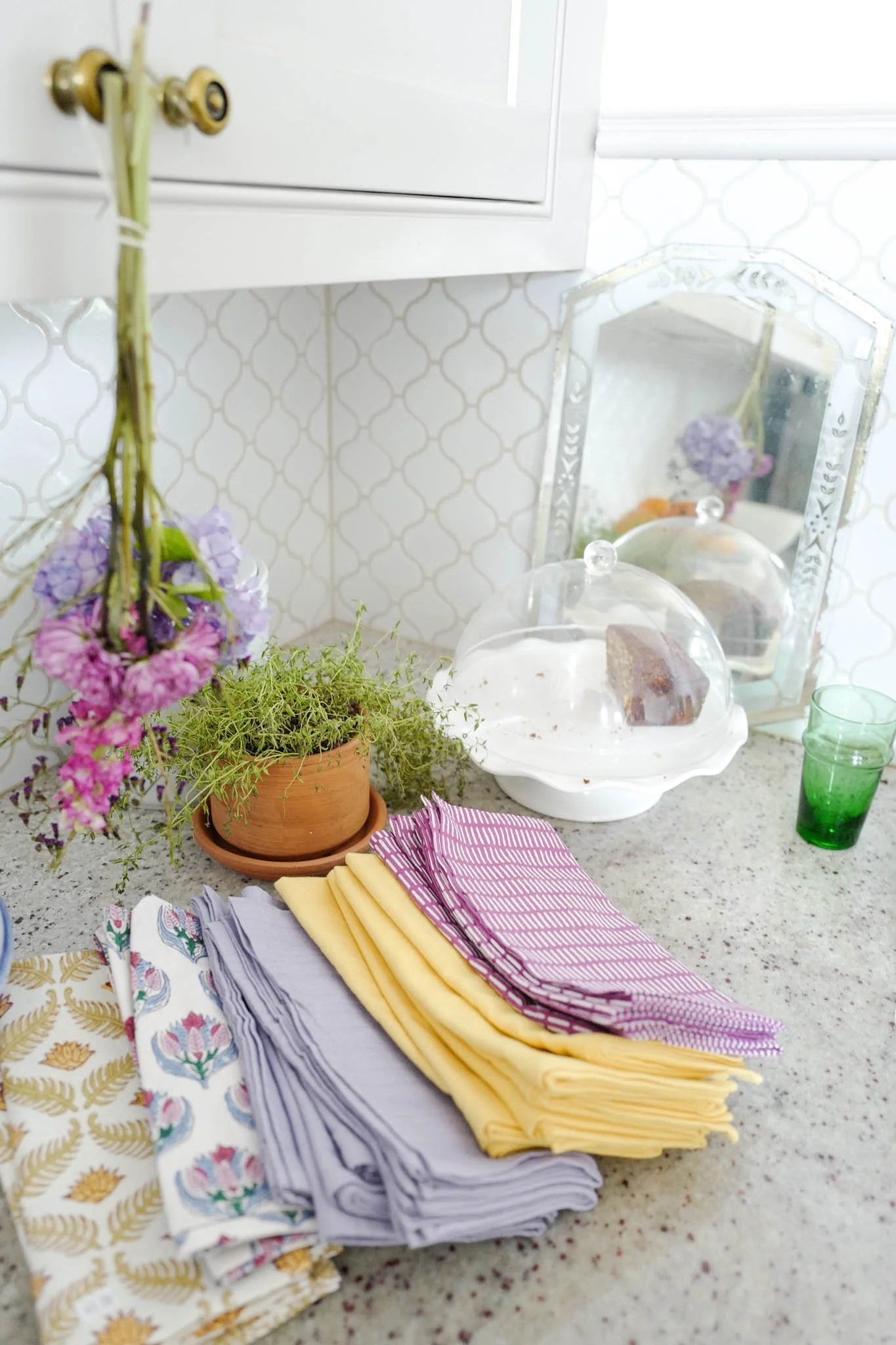 Dare I say, there’s a slight chill in the air this morning! Lately, I’ve been collecting all the bits and bobs to make our home feel cozier for fall. Fresh herbs on the kitchen counter, fruit bowls around the house for easy snacking, and fresh (along with dried) flowers displayed in as many places indoors as my garden will produce. This week I found some colorful cotton napkins at a local shop…these days I especially love shopping locally and appreciate the shopping experience in person more than in recent years past. But of course will forever love the ability to shop from home in my pajamas as well. Here’s some more napkin sets I’m currently eyeing.