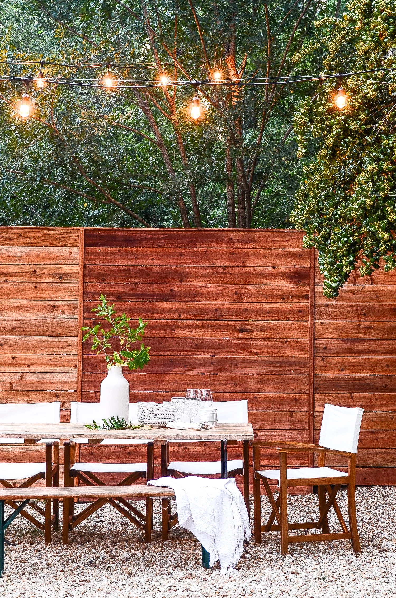 Directors Chair, Serena & Lily | String Lights, Pottery Barn | Beer Garden Bench, World Market